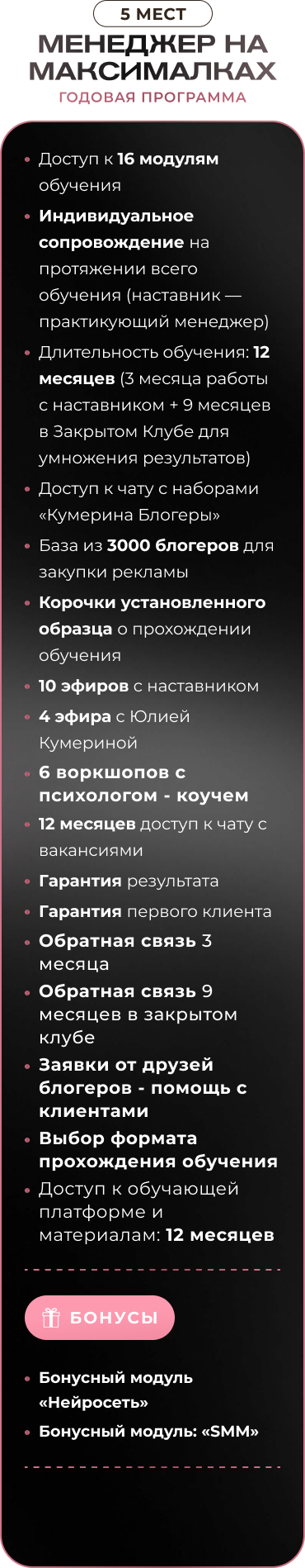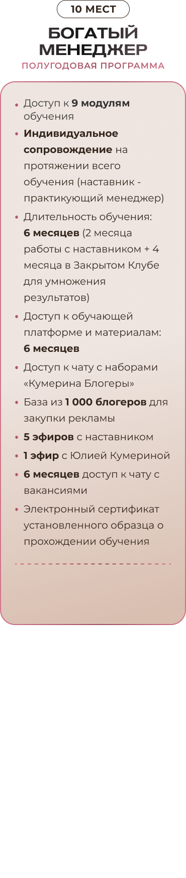 Массовые курсы дают водянистые знания, которые не помогают заработать. Средний заработок наших учениц 77 тысяч рублей уже во время обучения. Также многие ученики выходят на доход 150, 200, 300 тысяч рублей во время обучения. После обучения покупают себе квартиры, машины, осуществляют мечты, путешествуют. Я заинтересована выпускать квалифицированных специалистов, которые входят в 5% лучших менеджеров на рынке. И я знаю работающие связки и актуальные инструменты для получения высоких результатов, чему обучу и вас.